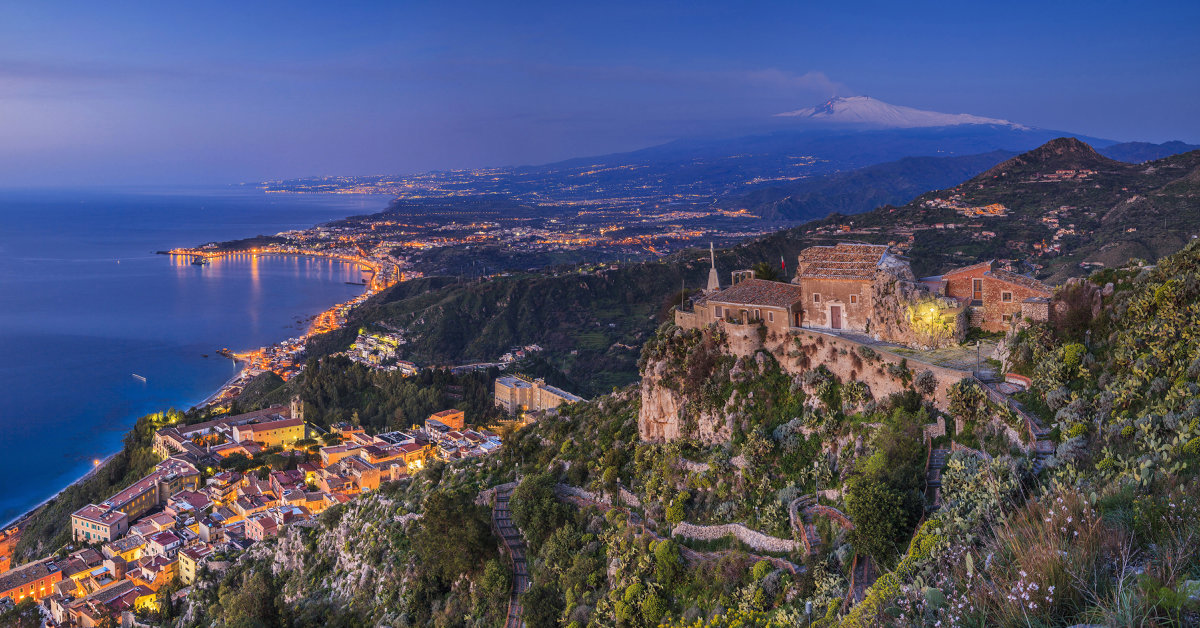 vulkanen Etna i väster och Medelhavet i öster. Det är en